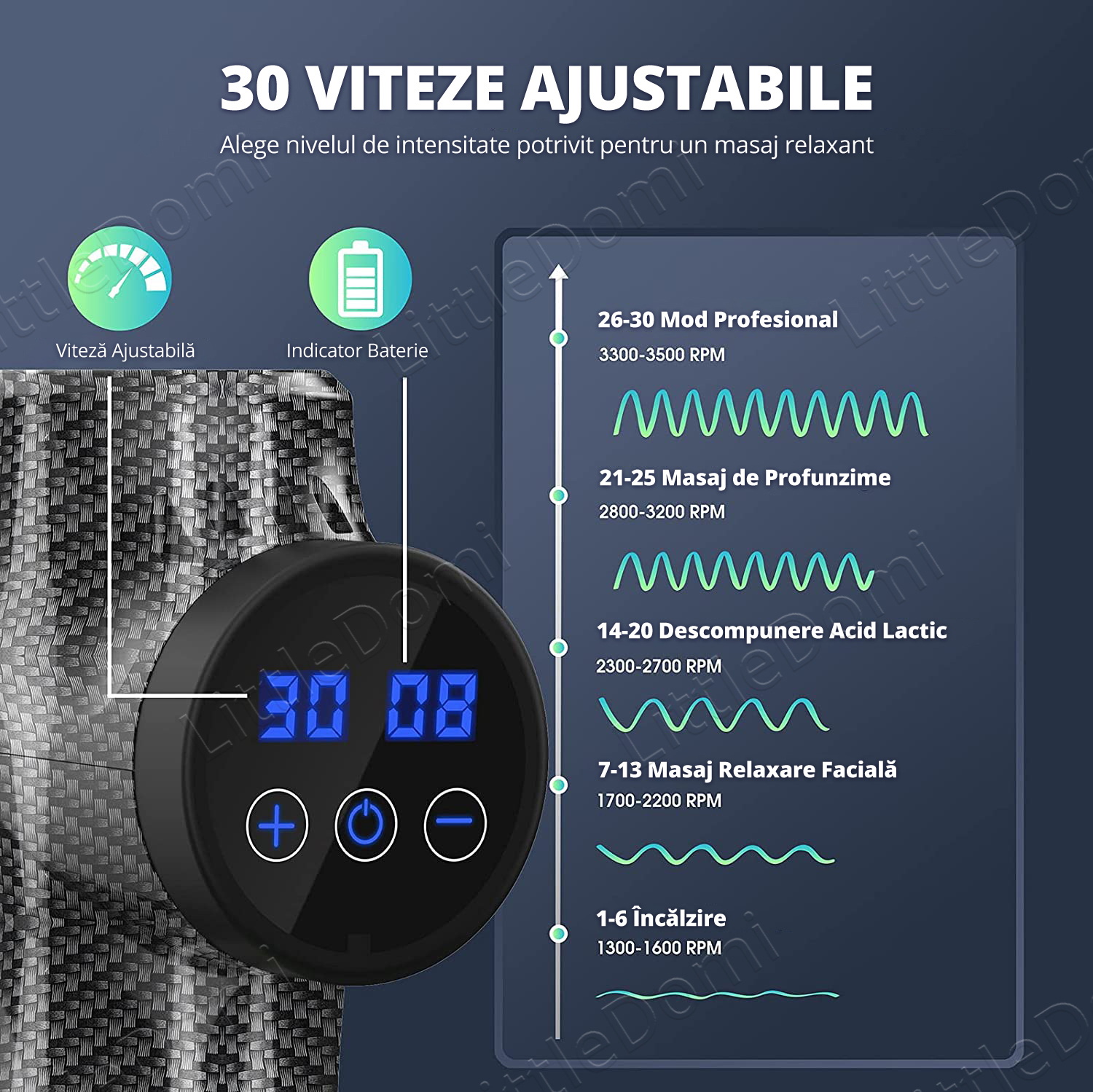 Viteza maxima de 3500 RPM si 30 de niveluri de viteza disponibile _x000D_ _x000D_Poate atinge viteza de pana la 3.500 rotatii pe minut, poti simti cu adevarat ca muschii tai sunt tratati cu un masaj profesional. Intensitatea masajului este reglabila. Exista 30 de viteze disponibile care va permit sa variati presiunea si viteza in functie de conditiile dvs. _x000D_ |