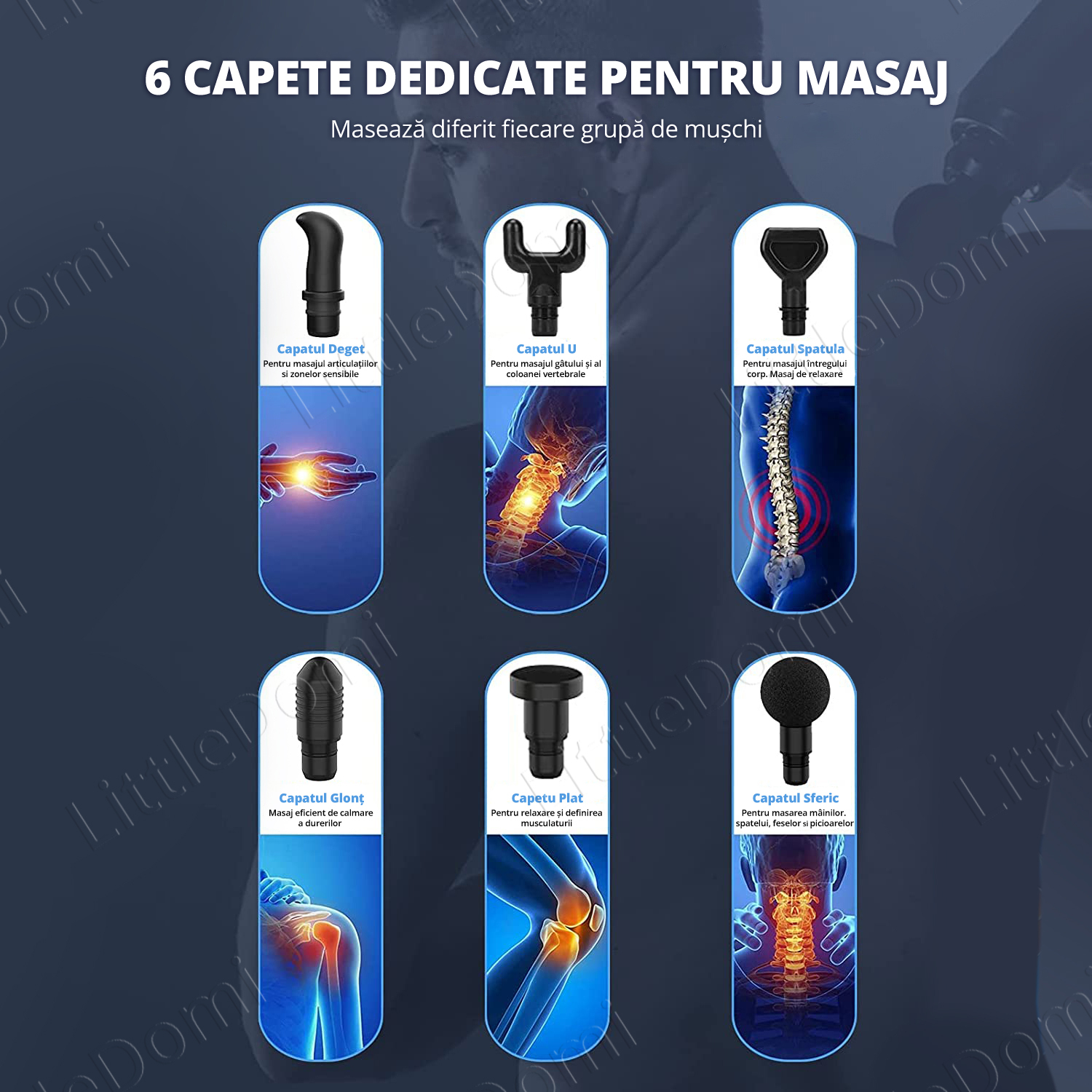 _x000D_ _x000D_Pistolul de masaj este un dispozitiv de masaj muscular care foloseste presiunea pulsata pentru a se concentra profund in tesutul muscular. Pistolul de masaj pentru tesuturi profunde poate ameliora rigiditatea si durerea musculara, promoveaza circulatia sangelui. Cand simtiti dureri musculare, oboseala sau doriti sa va relaxati, pistolul de masaj va poate oferi un masaj instantaneu.