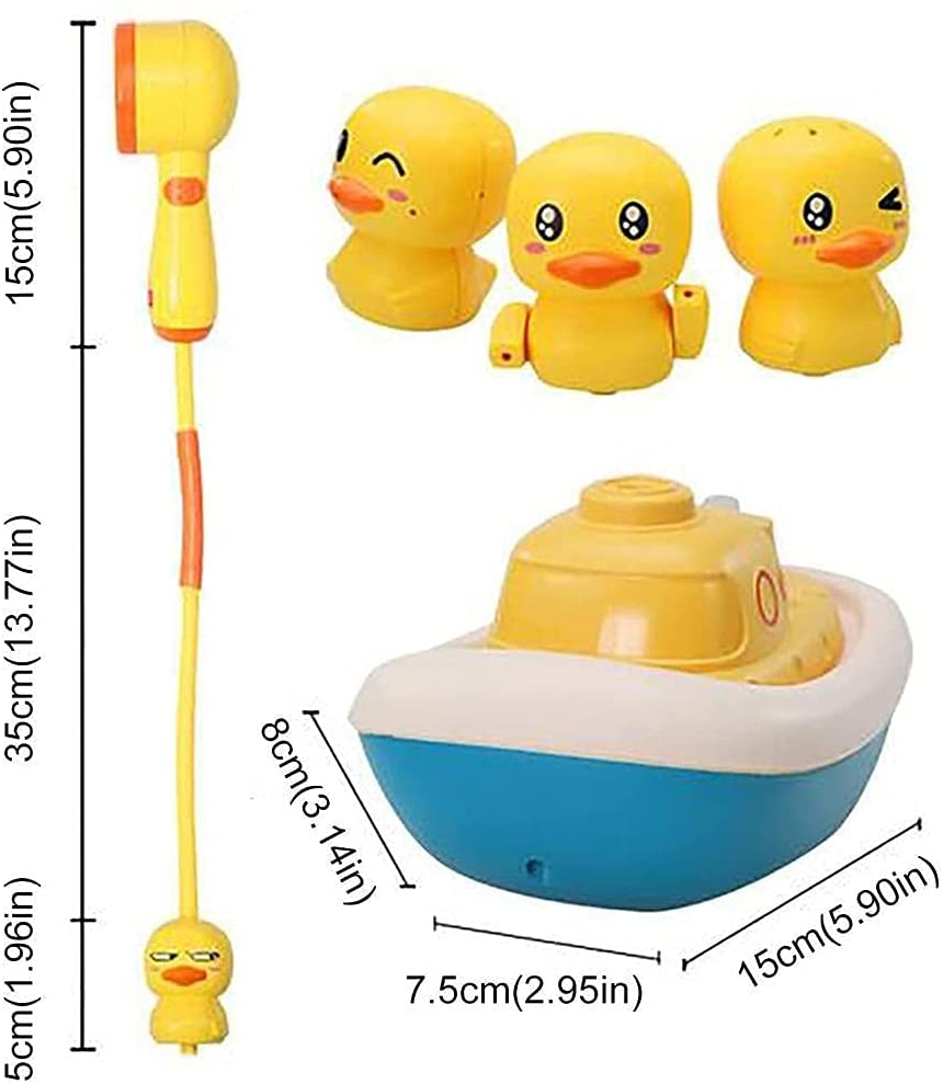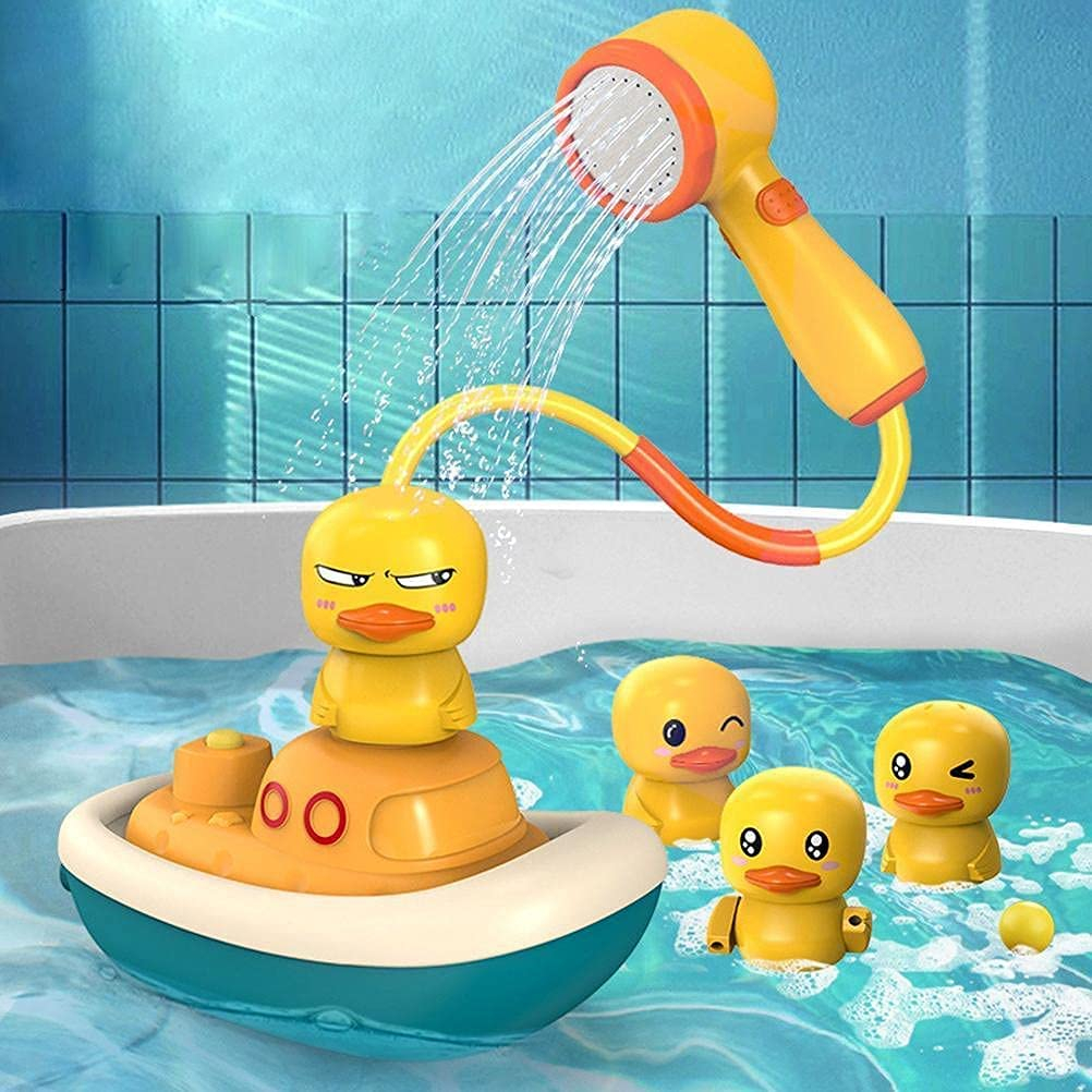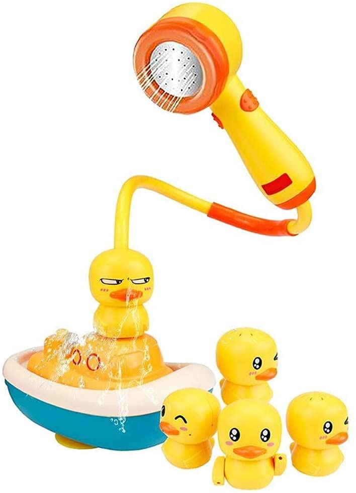 Jucarie de Baie tip Dus Portabil pentru Bebelusi si Copii, LittleDomi, Forma de Barca, 4 Capete tip Ratusca Interschimbabile, Prindere cu Ventuza, Galben