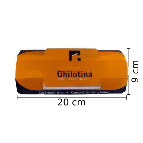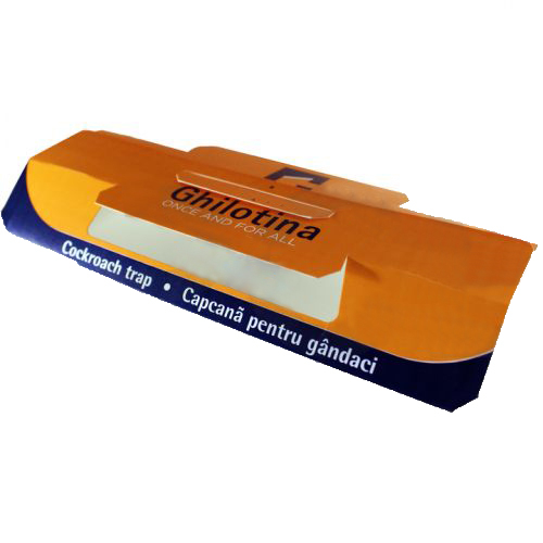 Ghilotina t225, adeziv gandaci este o capcana pentru gandaci care vine sub forma unei casute. Aceasta capcana este prevazuta cu patru intrari si este utilizata la scara larga pentru a monitoriza populatiile de gandaci. Fiecare capcana poate fi livrata cu momeala sau cu o tableta cu atractant alimentar. Pentru capcanele care nu sunt prevazute cu momeala, se poate aplica atractant. Utilizati capcana aproape de zonele de depozitare si operationale pentru a detecta infestari cu gandaci de bucatarie. Simplu de folosit, usor de asamblat, poate fi plasat atat orizontal cat si vertical.